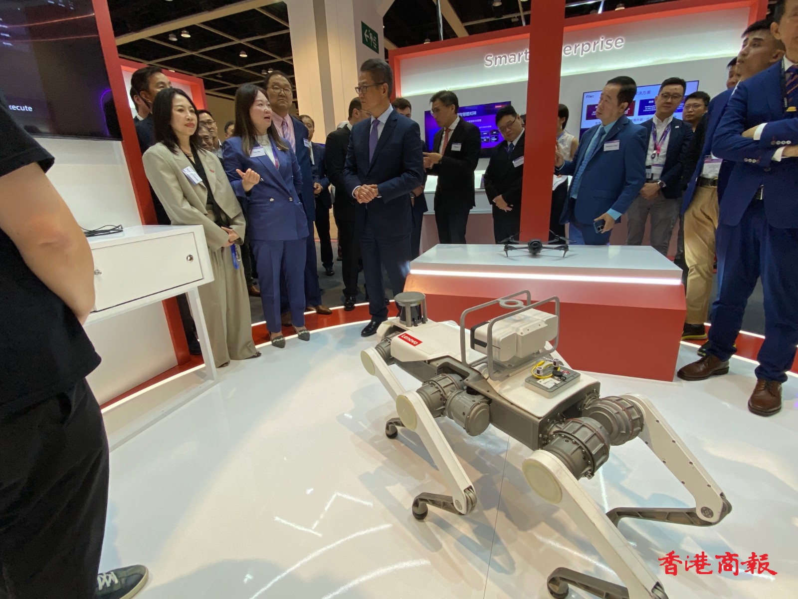 開(kāi)幕禮後陳茂波聯(lián)同多位「一帶一路」共建國(guó)家的駐港領(lǐng)事,參觀了聯(lián)想、華為、聯(lián)通等多家企業(yè)的展區(qū)。
