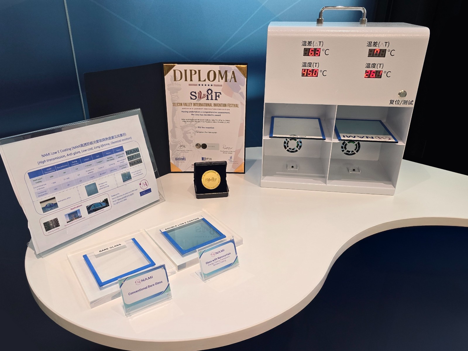 在標(biāo)注透明透光納米窗簾的展臺前,項(xiàng)目負(fù)責(zé)人保時幕牆有限公司副項(xiàng)目總監(jiān)鄒啟榮先生介紹到,此納米塗層可應(yīng)用於各類窗戶,特別是舊樓,具備阻擋50%太陽能量、超過60%可見光穿透率及低於6%反射率的全球領(lǐng)先節(jié)能表現(xiàn),施工簡便且成本低廉。該項(xiàng)目榮獲2025矽谷國際發(fā)明節(jié)金獎、2025愛迪生獎金獎以及2024全球百大科技研發(fā)獎。