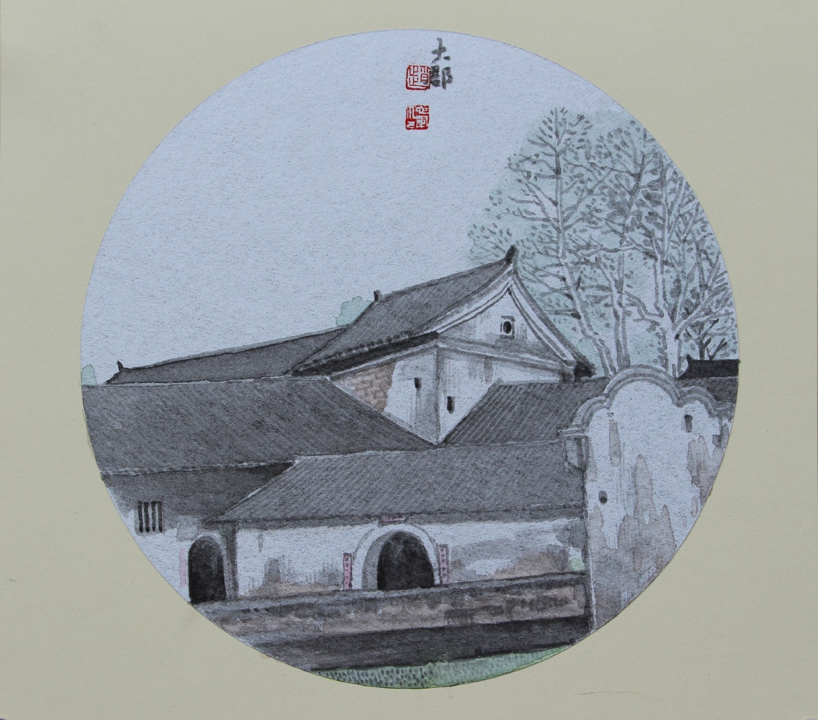 《客家民居》38cm*38cm 水墨設(shè)色 作品創(chuàng)作者:趙志軍(字之境、號(hào)大郡)