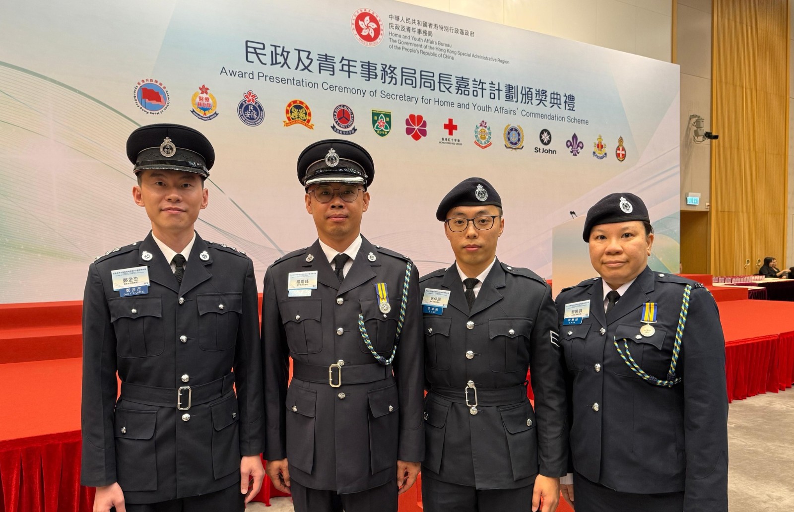 民政及青年事務(wù)局局長(zhǎng)嘉許計(jì)劃2024頒獎(jiǎng)典禮日前舉行,本年度民安隊(duì)共4位隊(duì)員獲得嘉許,包括楊澄峰、鄭金杰、黎麗娟及李卓倫。