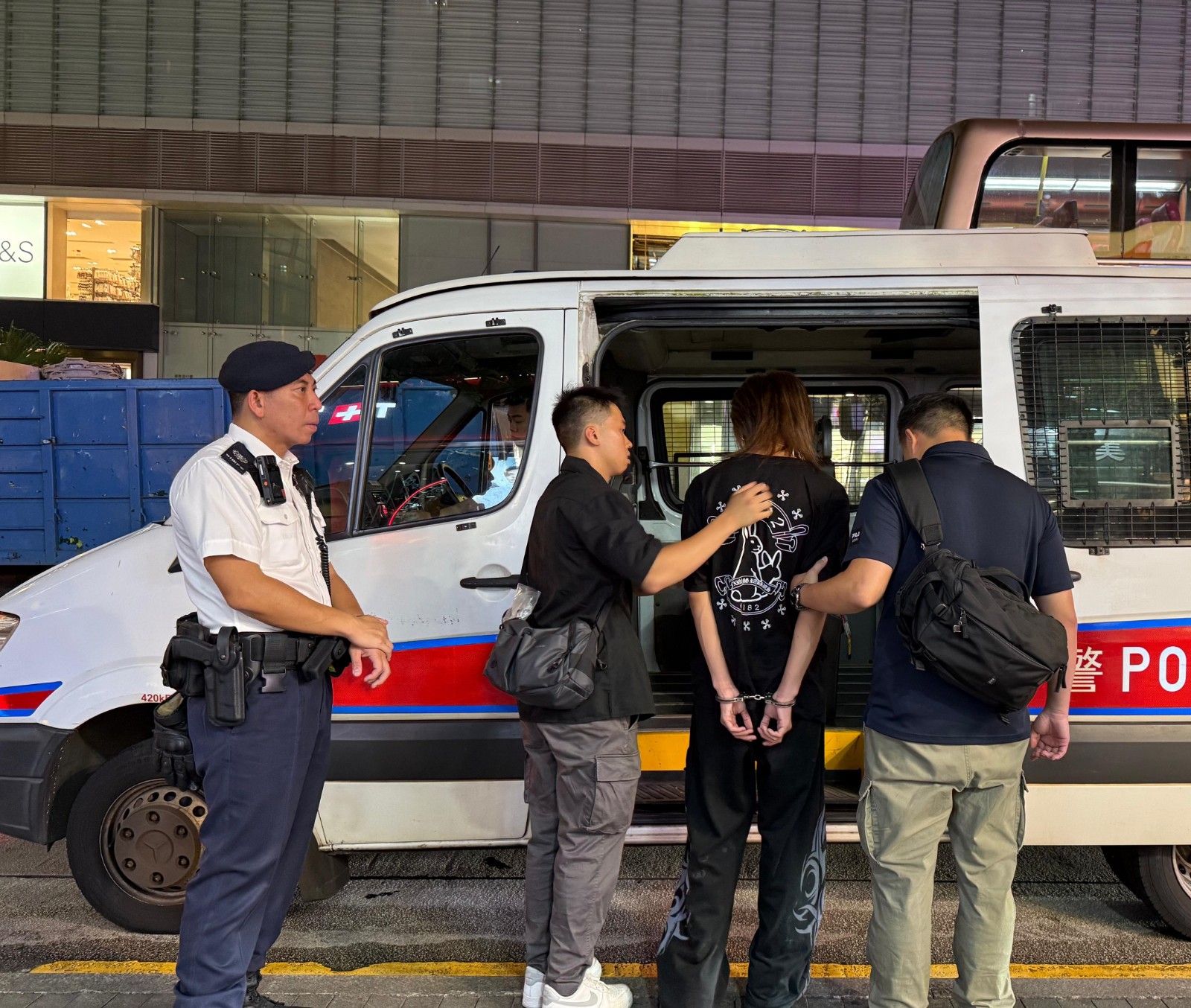 行動(dòng)中,人員突擊搜查多個(gè)罪惡黑點(diǎn),包括彌敦道36號(hào)大廈內(nèi)超過200間賓館中截查超過400人,拘捕一名17歲少年及一名38歲非華裔男子,涉嫌「藏有危險(xiǎn)藥物」及「外出時(shí)沒有攜帶身份證明文件」。同時(shí)發(fā)現(xiàn)一名35歲非華裔男子為通緝?nèi)耸俊?/p>