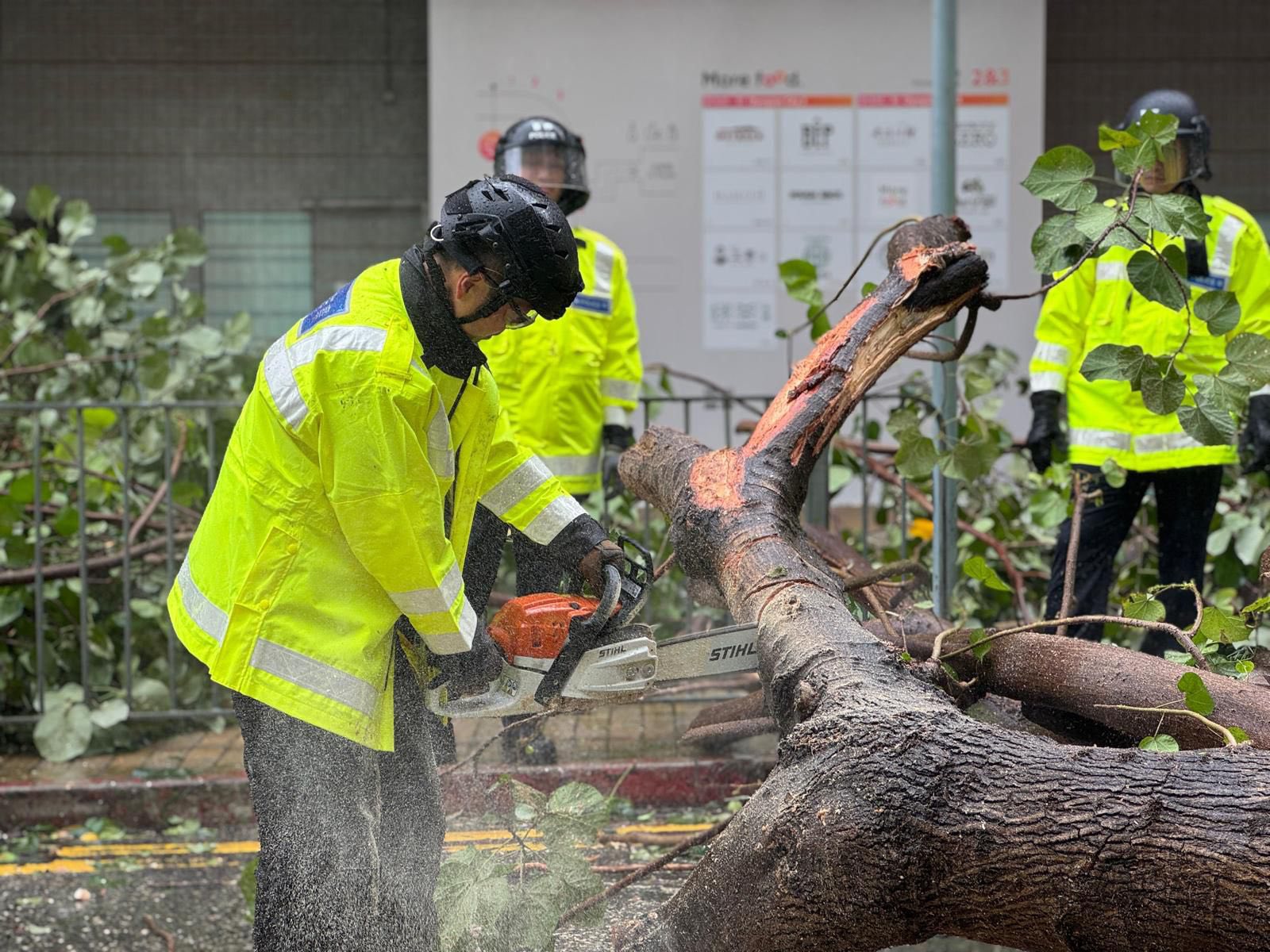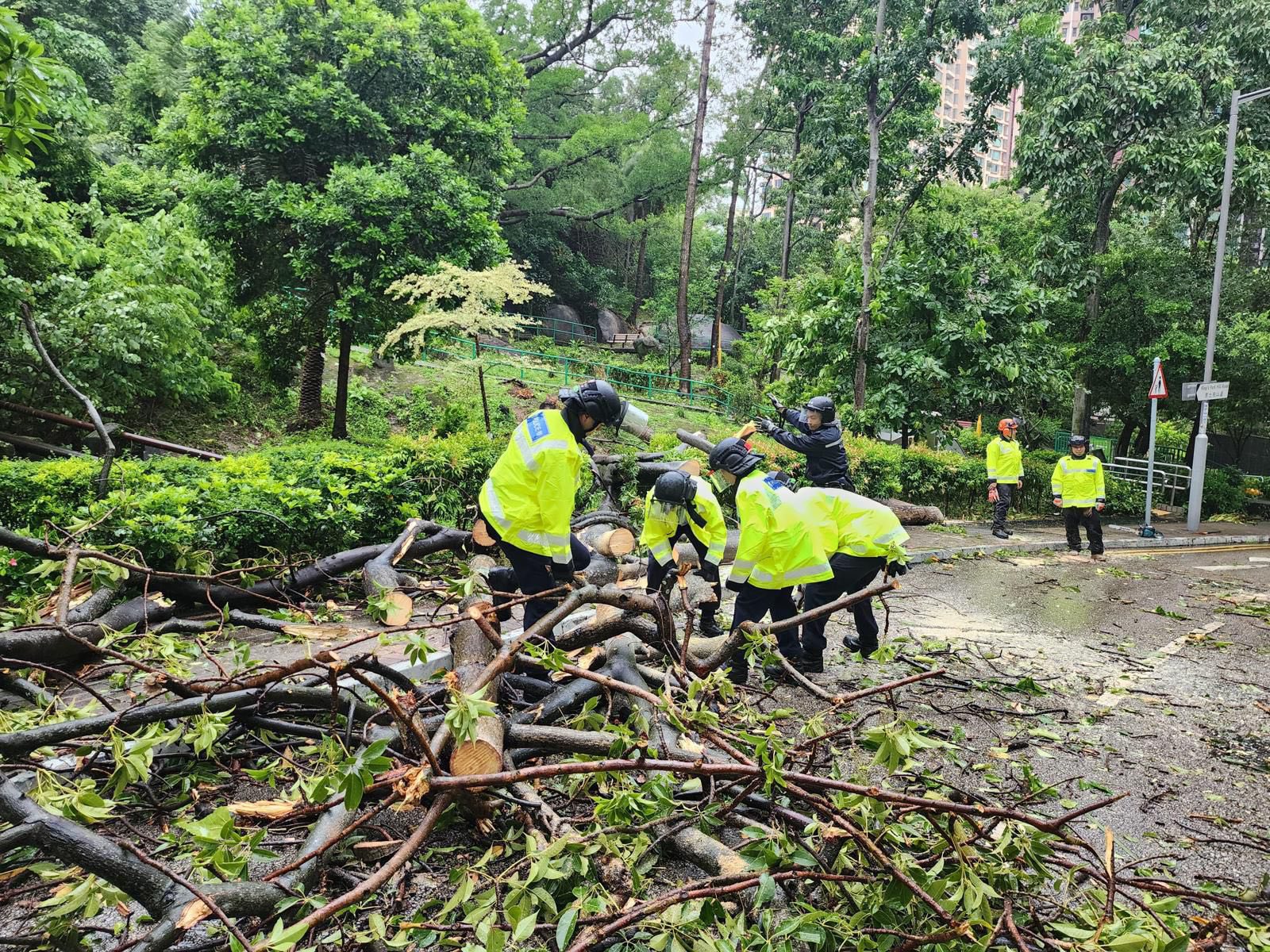 香港天文臺於今日(8日)下午1時10分前仍然懸掛8號烈風(fēng)或暴風(fēng)信號,本港多區(qū)持續(xù)受強風(fēng)驟雨影響。面對惡劣天氣,警務(wù)人員堅守崗位,站在風(fēng)雨最前線,全力守護市民與城市安全。(記者 區(qū)天海)