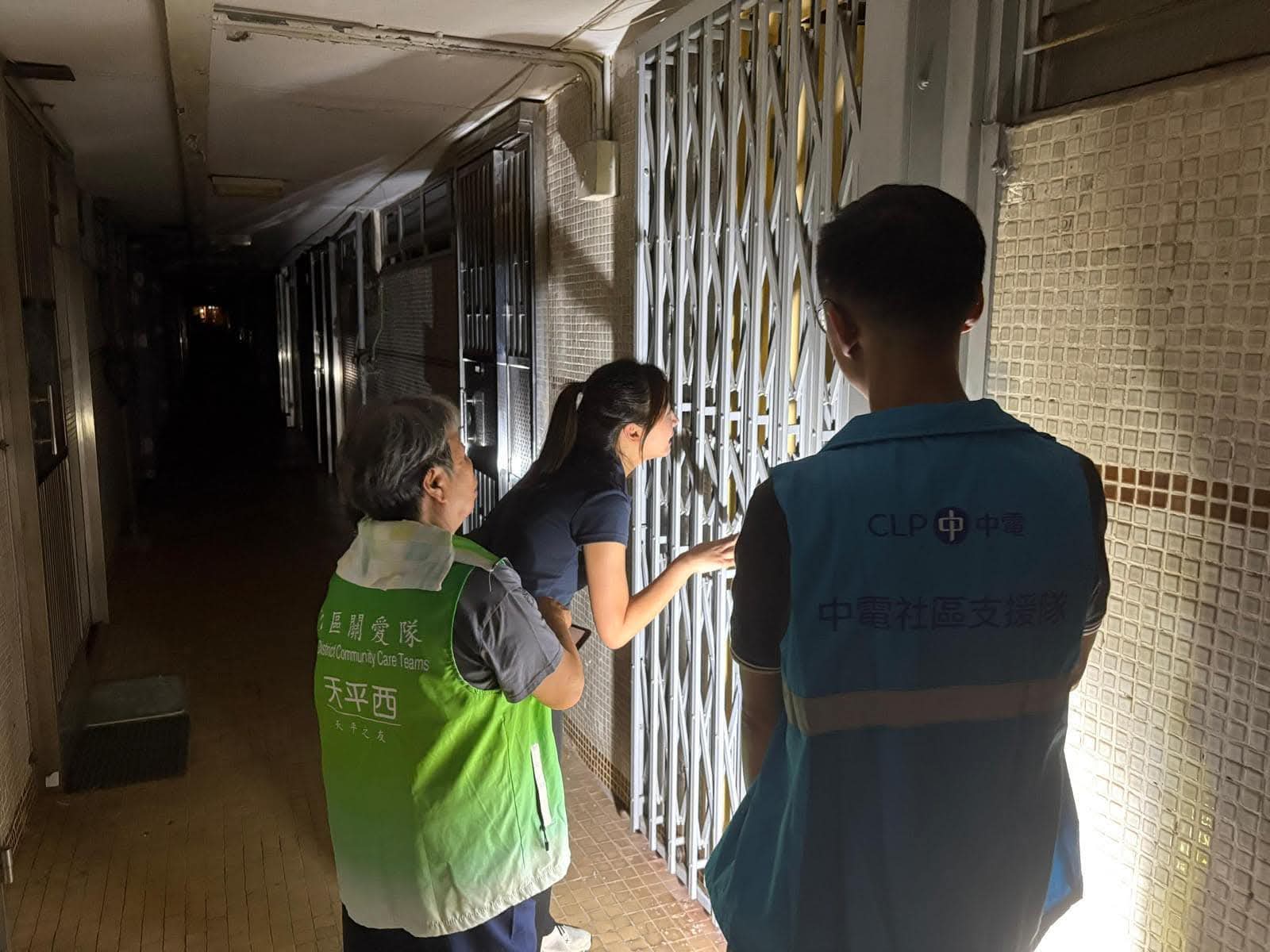 上水天平邨天明樓停電,北區(qū)民政處、區(qū)議員、關(guān)愛隊(duì)及政府部門全力支援居民。 民政事務(wù)總署供圖
