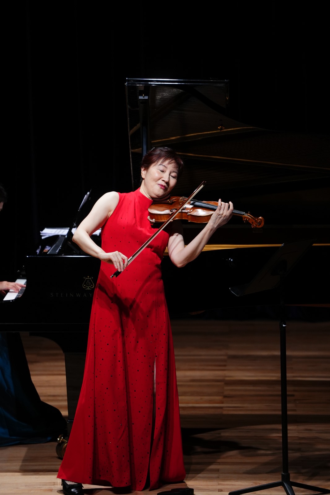 她們以《漁家姑娘在海邊》為開場(chǎng)白,陳蓉暉演出前說(shuō),就是因爲(wèi)喜歡這首曲子和大海,同時(shí)與鄭慧的互動(dòng)非常流暢和開心,綵排時(shí)整天想跟她跳舞。是的,這開場(chǎng)曲的確令人有舞興,被大紅色包裹的陳蓉暉人琴合一,像一枚五線音符隨鄭慧的鋼琴?gòu)椬辔鑴?dòng)。