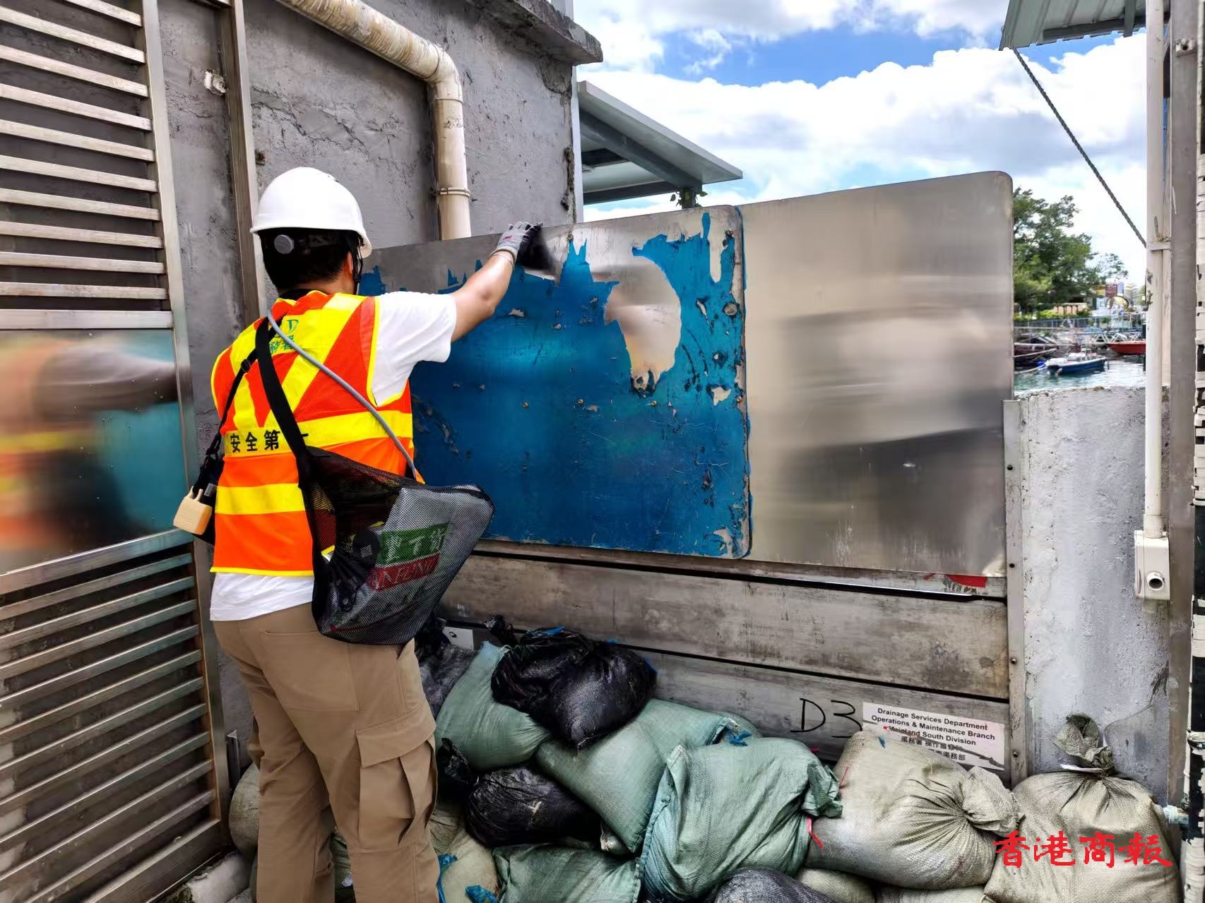 現(xiàn)場(chǎng)放置沙包。記者 馮瀚文攝
