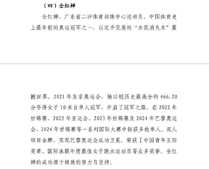 9月30日,廣東省體育局官網(wǎng)公示全國體育系統(tǒng)先進個人擬推薦名單,13名運動員入選,包括全紅嬋、陳藝文、謝思埸、梁偉鏗、王柳懿、王芊懿、王欣瑜等。
