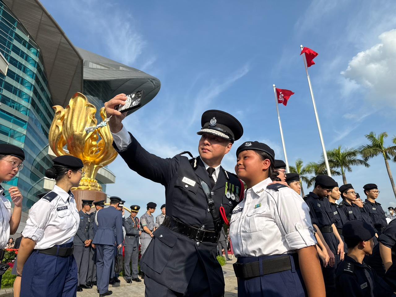 升旗儀式過後,護旗方隊步伐齊整離開會場。警務(wù)處處長周一鳴亦在場觀禮,並與少年制服團隊隊員合照留念。(記者 區(qū)天海)