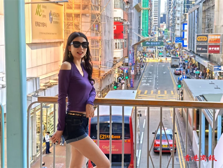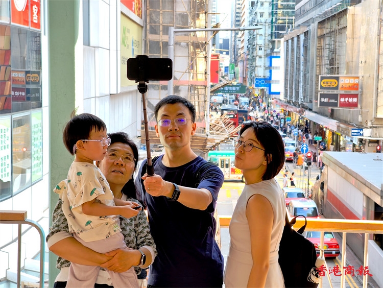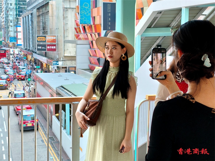 近期在內(nèi)地社交媒體獲力推的熱門打卡點(diǎn)「旺角行人天橋」,在這個國慶中秋長假吸引了大量旅客前來,以西洋菜南街等附近一帶的街道景色為背景拍照留念。(記者 馮瀚文攝)