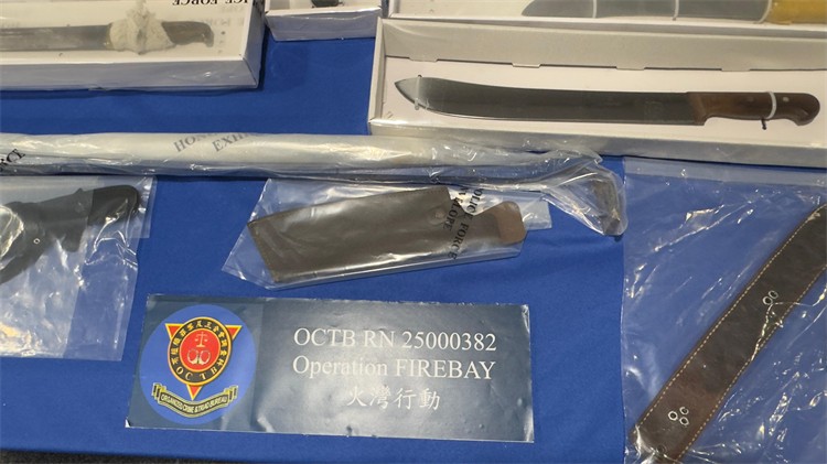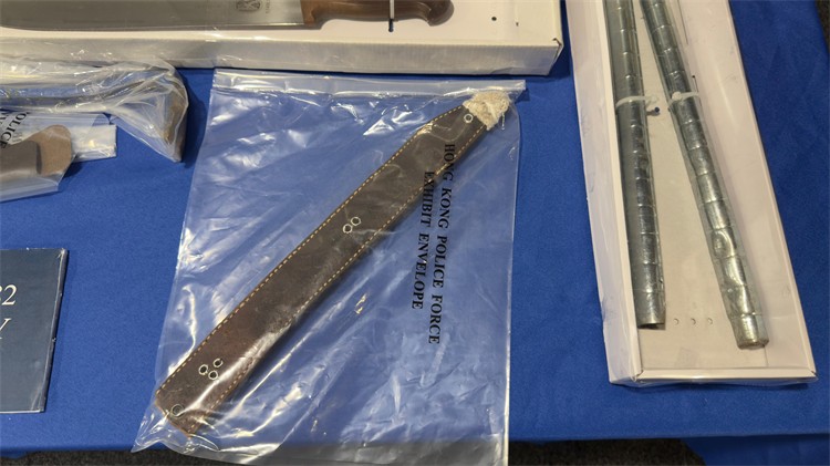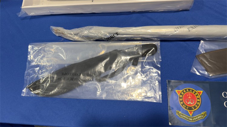 行動(dòng)中警方在車內(nèi)檢獲一批攻擊性武器,包括牛肉刀、鐵棍、棒球棍、鐵筆及犯案手套。並在附近一間空置村屋及被該團(tuán)夥操控的非法賭檔內(nèi)檢獲另外6把牛肉刀。