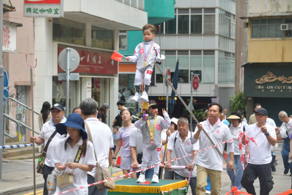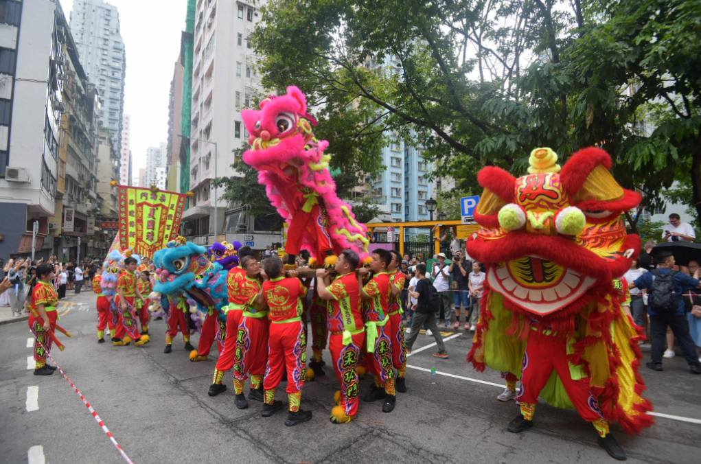 出巡隊(duì)伍約有500人,包括傳統(tǒng)紮作與舞龍技藝的百尺薄扶林火龍、承傳南獅與武藝功架的醒獅和舞麒麟,以及扮成神明出巡、盡顯民俗工藝的長洲飄色等極富本港非遺特色的隊(duì)伍,加上傳統(tǒng)廟宇儀仗、禮生、旗隊(duì)、廟宇及宗教文化隊(duì)伍等,沿途鑼鼓喧天,氣勢恢弘,吸引大批市民駐足拍照,感受濃厚的節(jié)慶氛圍。