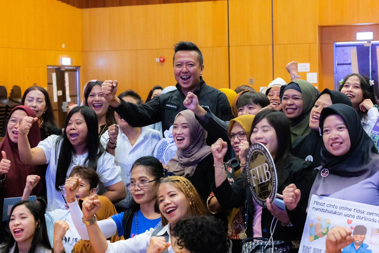 在講座尾聲,印尼駐港總領(lǐng)事館特別邀請(qǐng)人氣印尼華僑「展超Sir」驚喜現(xiàn)身,「展超Sir」身穿工作服到場(chǎng),由拆彈專家化身為防騙大使,並用印尼語呼籲印尼傭工提防騙子及提醒身邊人。