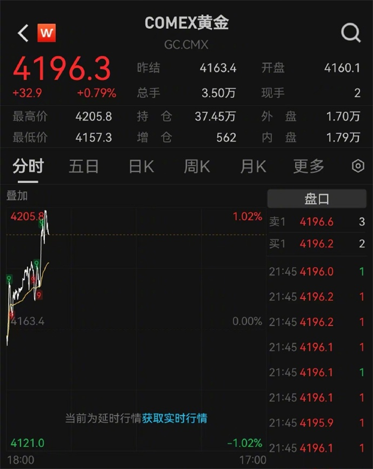 10月15日,國(guó)際黃金再創(chuàng)歷史新高。截至10時(shí),COMEX黃金突破4200美元/盎司大關(guān),最高觸及4205.8美元/盎司,最大漲幅1.02%;倫敦現(xiàn)貨黃金突破4180美元關(guān)口,最高觸及4186.8美元/盎司,最高漲幅1.09%。