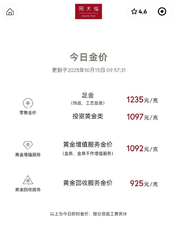 受金價(jià)上漲影響,15日國(guó)內(nèi)金飾克價(jià)繼續(xù)上調(diào),周大福足金首飾價(jià)格由前日的1215元/克上漲至1235元/克,一夜大漲20元;周生生足金首飾價(jià)格由前日的1213元/克上漲至1227元/克,一夜大漲14元;老鳳祥足金首飾價(jià)格由前日的1206元/克上漲至1230元/克,一夜大漲24元。