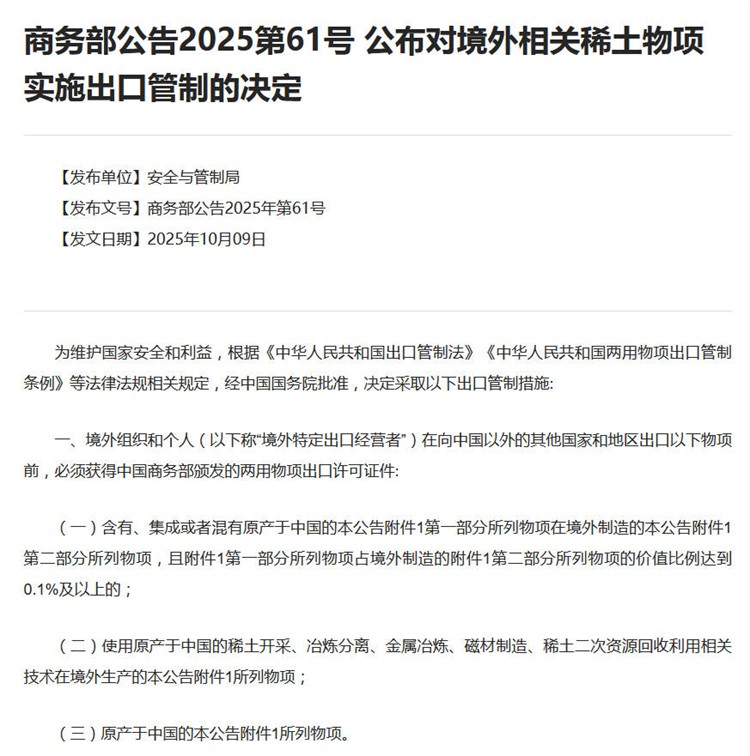 10月9日,經(jīng)中國國務(wù)院批準,商務(wù)部發(fā)布公告,對含有中國成分的部分境外稀土相關(guān)物項實施出口管制,《中華人民共和國兩用物項出口管制清單》也同步予以更新。