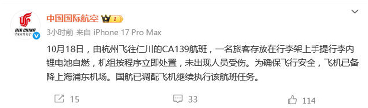10月18日,由杭州飛往仁川的CA139航班,一名旅客存放在行李架上手提行李內鋰電池自燃,機組按程序立即處置,未出現(xiàn)人員受傷。為確保飛行安全,飛機已備降上海浦東機場。國航已調配飛機繼續(xù)執(zhí)行該航班任務。(圖源 橙柿互動)