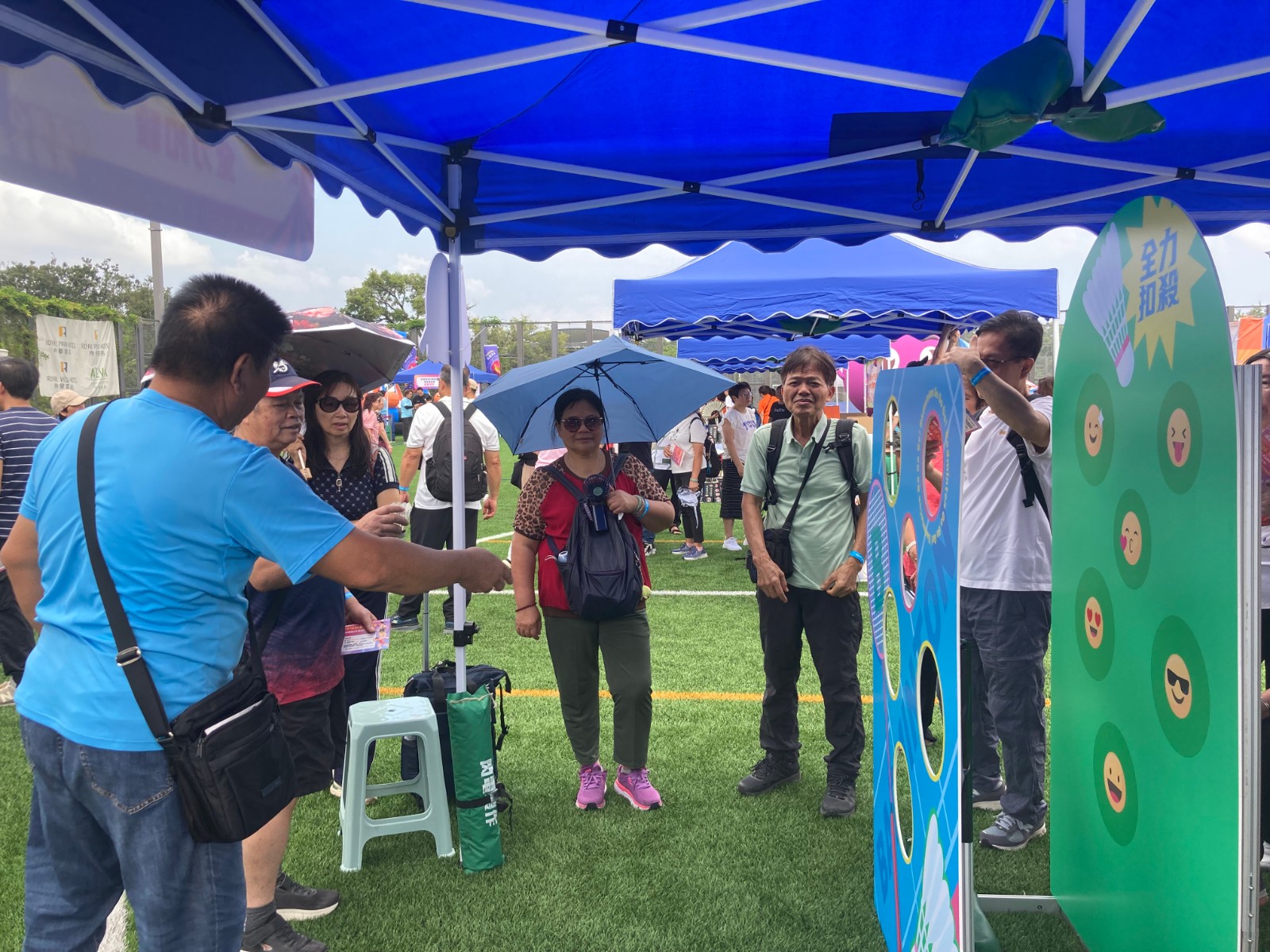 謝先生帶同屬會十來個會員來參加嘉年華活動。他說自己從屯門過來,有點(diǎn)遠(yuǎn)。他剛剛玩打羽毛球遊戲,玩得很開心。