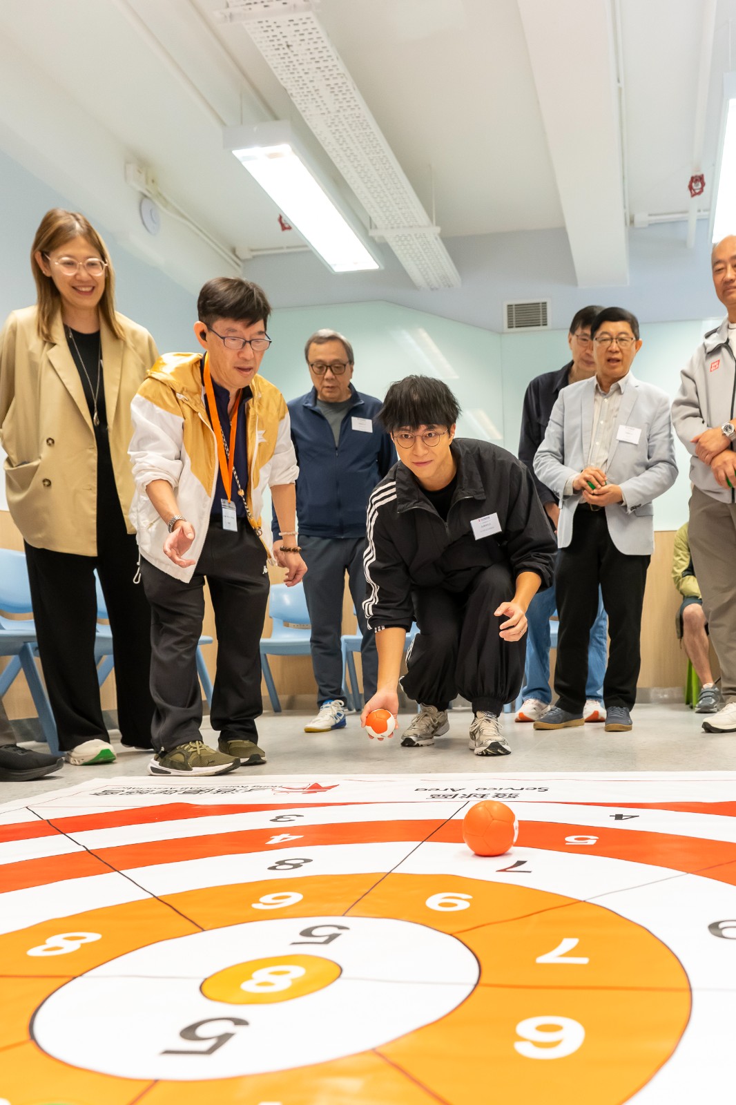 一眾嘉賓試玩由香港傷健協(xié)會(huì)原創(chuàng)的新興運(yùn)動(dòng) -— 數(shù)健球。