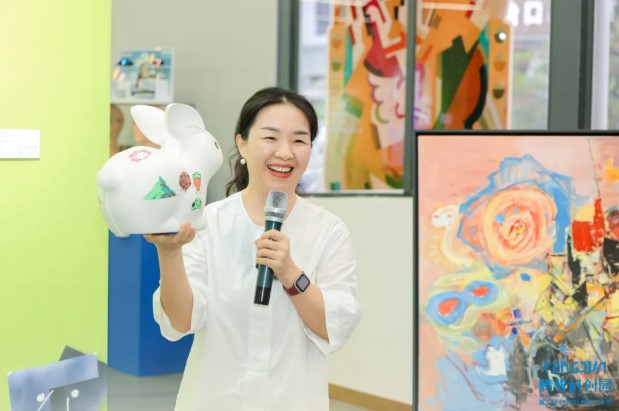 活動伊始,「中秋兔兔手繪作品展評」 環(huán)節(jié)便點燃了現(xiàn)場氛圍。這些參展作品的「載體」特別,並非專業(yè)畫紙,而是一款中秋月餅的白色紙殼包裝盒,形似一隻靈動的兔子。在活動發(fā)起之初,騰駿藝術(shù)節(jié)便希望以「環(huán)保+創(chuàng)意」的形式,讓傳統(tǒng)節(jié)日與藝術(shù)創(chuàng)作碰撞出火花,邀請大家發(fā)揮想象,用畫筆為素白的兔形包裝盒賦予生命力。經(jīng)過前期徵集,9件風格迥異的優(yōu)秀作品脫穎而出,站上本次展評的舞臺。最小年齡的創(chuàng)作者金泊志小朋友也通過VCR向大家講述自己的創(chuàng)作心得,他筆下的《GIOGIO》滿是童趣,瞬間暖化全場。