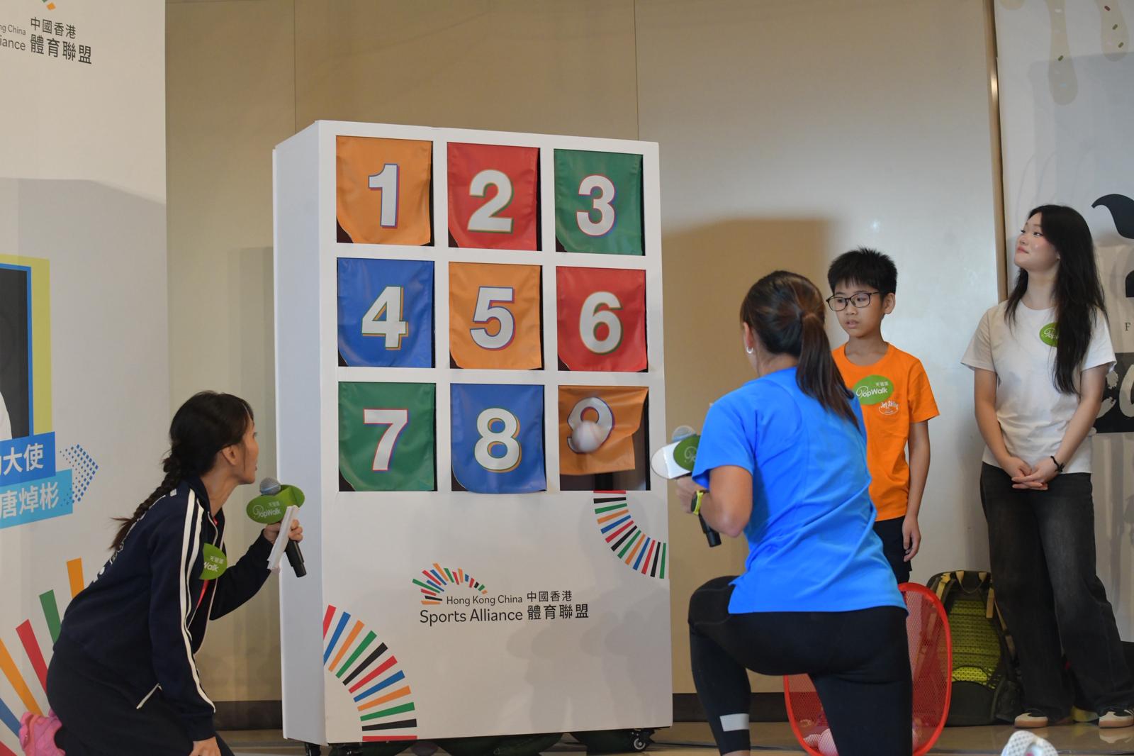 黃卓寧和唐焯彬,其後和參與活動(dòng)的小朋友組隊(duì)比賽,挑戰(zhàn)九宮格,他們需要將球體投擲到格內(nèi),愈高分為之勝出,眾人都相當(dāng)投入,活動(dòng)在一片歡呼聲中結(jié)束。(記者 葉家亨/攝影 崔俊良)