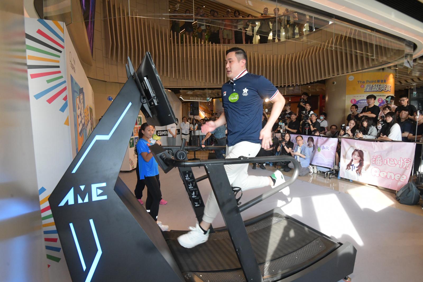唐焯彬應(yīng)大會(huì)司儀要求踏上跑步機(jī)試跑。(記者 崔俊良攝)
