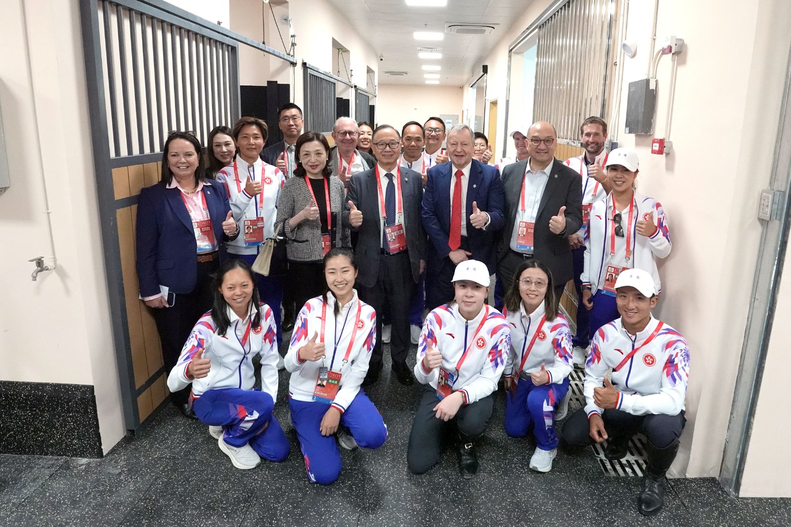 香港賽馬會(huì)主席廖長(zhǎng)江(第二排右四)、行政總裁應(yīng)家柏(第二排右三)、公司事務(wù)執(zhí)行總監(jiān)譚志源(第二排右二),與中國(guó)香港馬術(shù)總會(huì)代表,鼓勵(lì)一眾香港馬術(shù)代表隊(duì)成員。