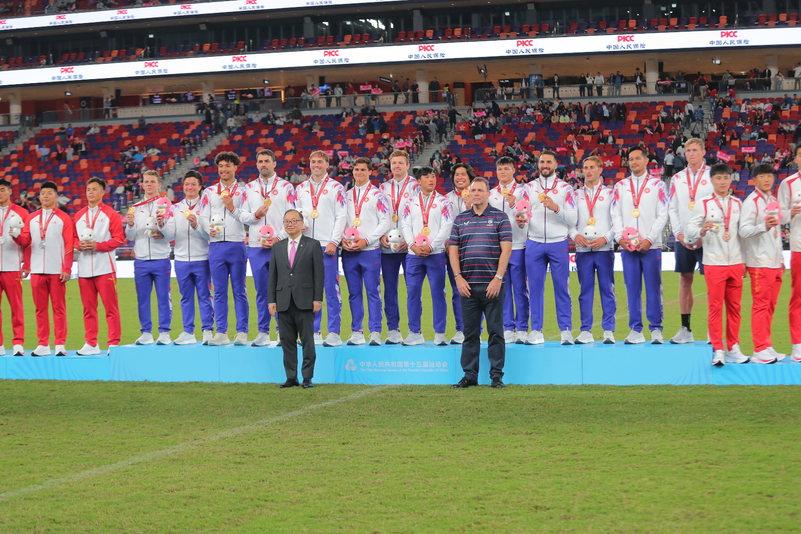 啟德主場館周五晚(14日)舉行全運會七人欖球賽事的金牌戰(zhàn),香港男子隊最終以26比19擊敗衛(wèi)冕的山東,主場奪金,並在頒獎嘉賓、香港賽馬會主席廖長江手上接過獎牌,七欖男隊將獲「賽馬會優(yōu)秀運動員獎勵計劃」獎金150萬港元,以作鼓勵。我們現在一齊重溫港隊在頒獎儀式的高光時刻。(志誠)