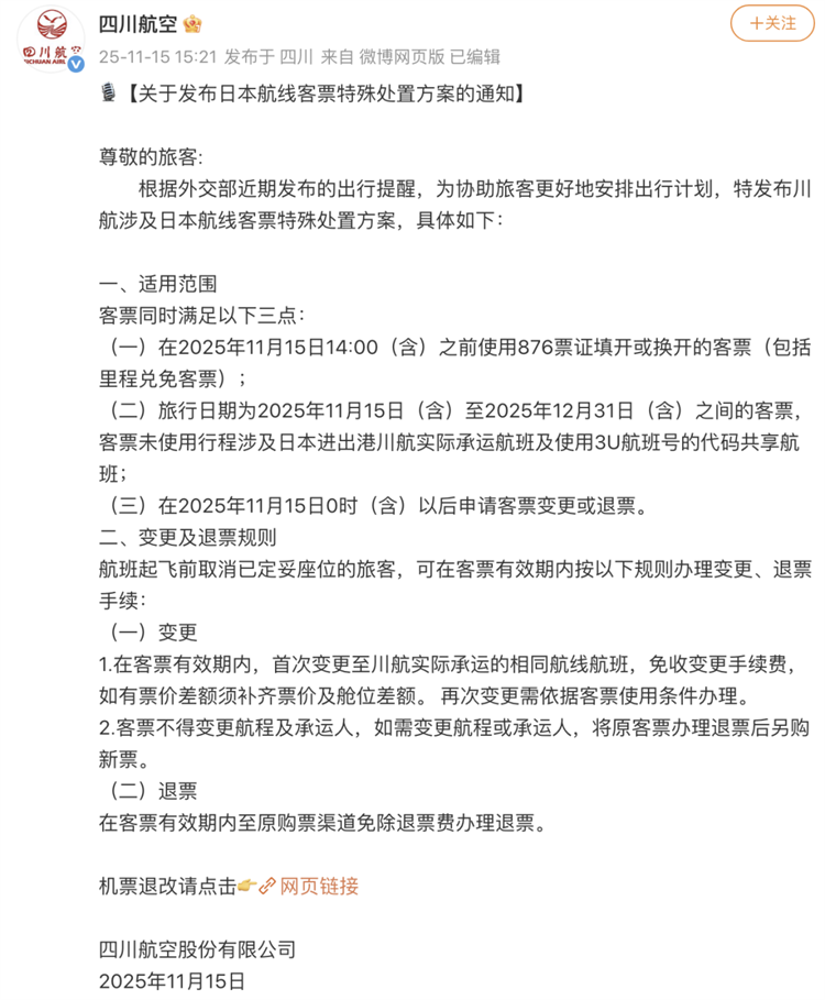 15日,國航、南航、東航、海航、川航、廈航等航司相繼發(fā)布通知,對於出行日期在12月31日之前,涉及日本相關航線且符合相關條件的客票,可予以免費退改處理。