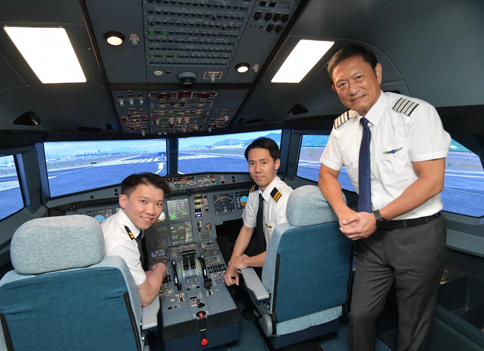陳永康(左)和鄧俊偉(中)在全新飛行模擬器內(nèi)合影,右為葉欣鴻。