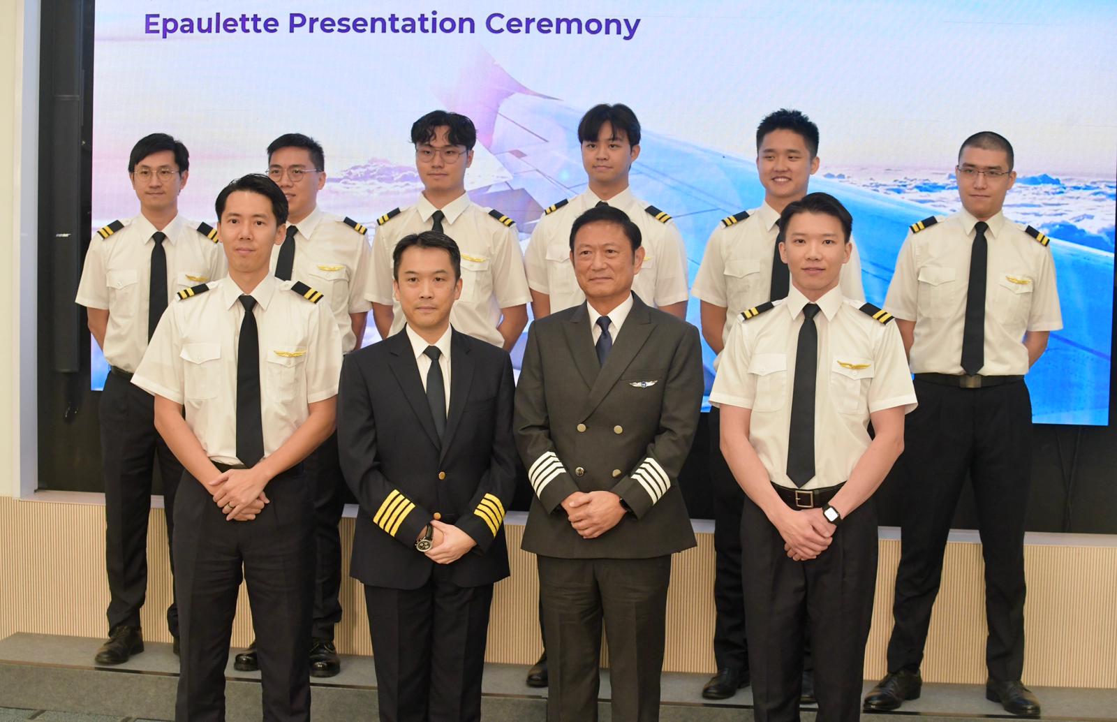 八位二副機師和周智衡(前排左二)飛行訓練及航空工程培訓中心總監(jiān)葉欣鴻(前排右二)在記者會上合影。