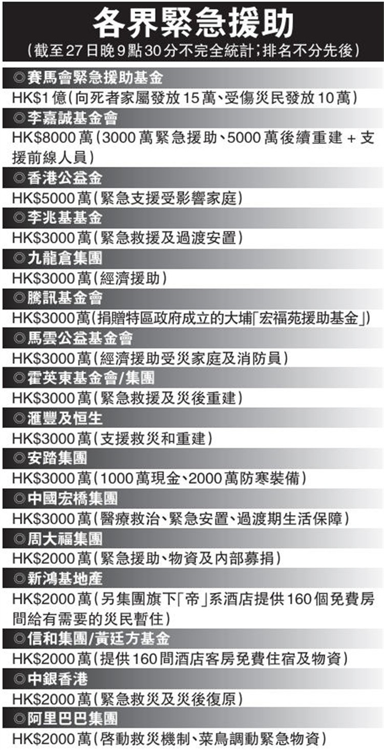【21:00】多家內(nèi)地企業(yè)及人道組織,以及本港多家基金會及商界集團(tuán),均相繼撥款協(xié)助災(zāi)民渡過難關(guān)。眾志成城,在短短一天之內(nèi),善款已累計超過5億元,至於救援物資更是不計其數(shù)。