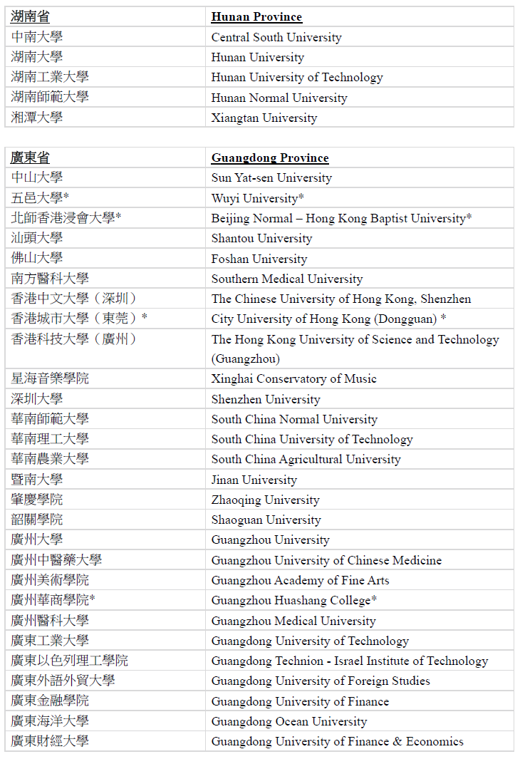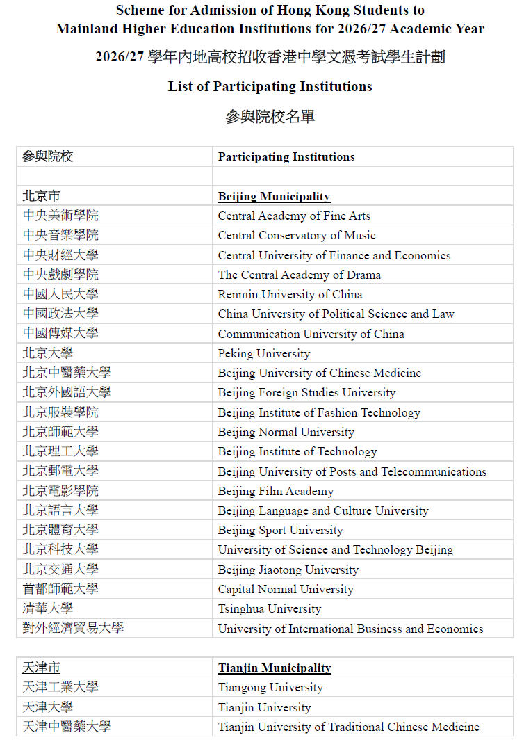 根據(jù)國家教育部公布有關(guān)2026/27學(xué)年文憑試收生計劃的具體安排,165所內(nèi)地高等院校(名單見附件)將依據(jù)香港中學(xué)文憑考試(文憑試)成績擇優(yōu)錄取參加2026年文憑試的香港學(xué)生,免卻同學(xué)參與內(nèi)地聯(lián)招試的需要。國家教育部已委託中華人民共和國普通高等學(xué)校聯(lián)合招收華僑港澳臺學(xué)生辦公室(聯(lián)招辦)負(fù)責(zé)網(wǎng)上報名及審核,並委託中國教育交流(港澳)中心(交流中心)承辦報名資格審核及招生宣傳等事宜。