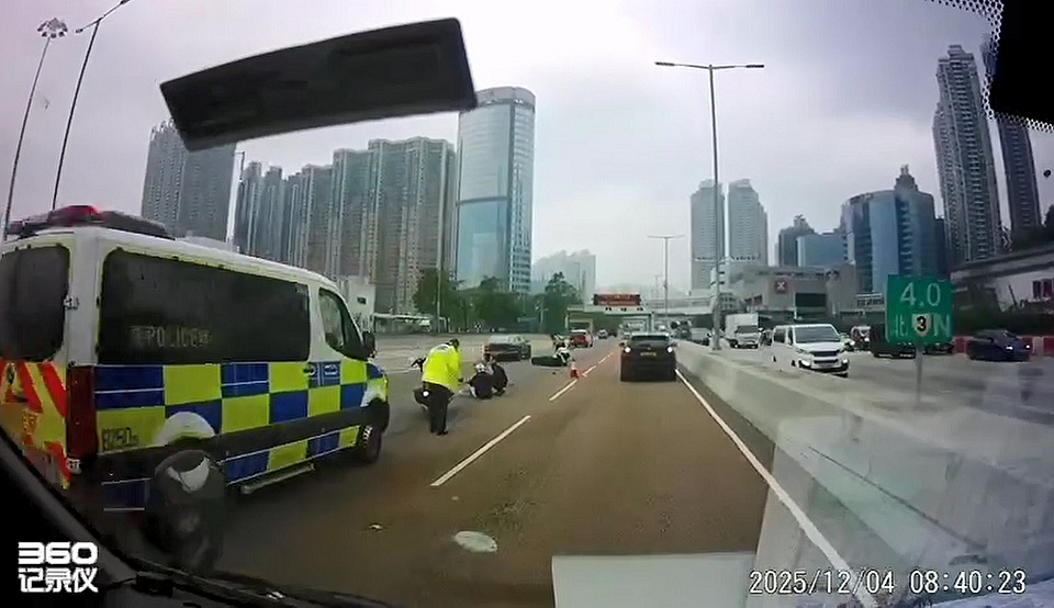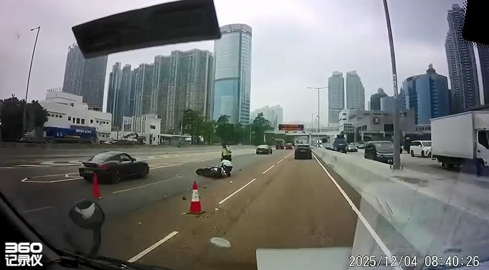 西九龍公路發(fā)生交通意外,今日(4日)早上8時(shí)許,兩名鐵騎士駕電單車(chē)往葵涌方向駛至近奧運(yùn)港鐵站時(shí),懷疑失控翻車(chē),兩人倒地受傷,警方接報(bào)到場(chǎng)封閉一段中線(xiàn),正調(diào)查意外原因。受意外影響,西九龍公路往葵涌方向受阻近一小時(shí)。(記者 區(qū)天海)