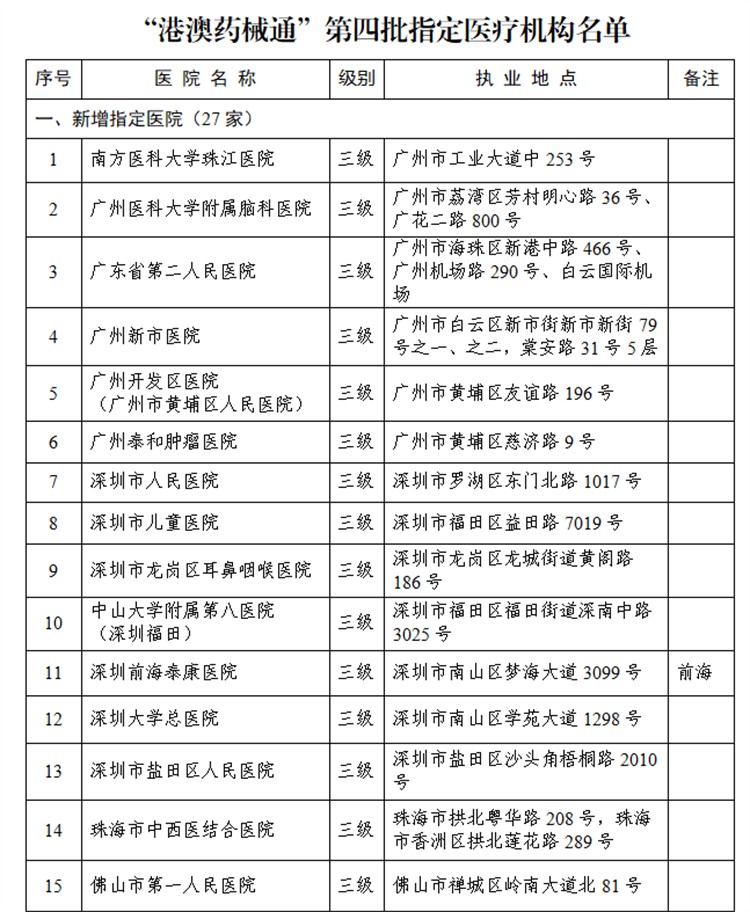 新增27家 「港澳藥械通」第四批指定醫(yī)療機構名單確定