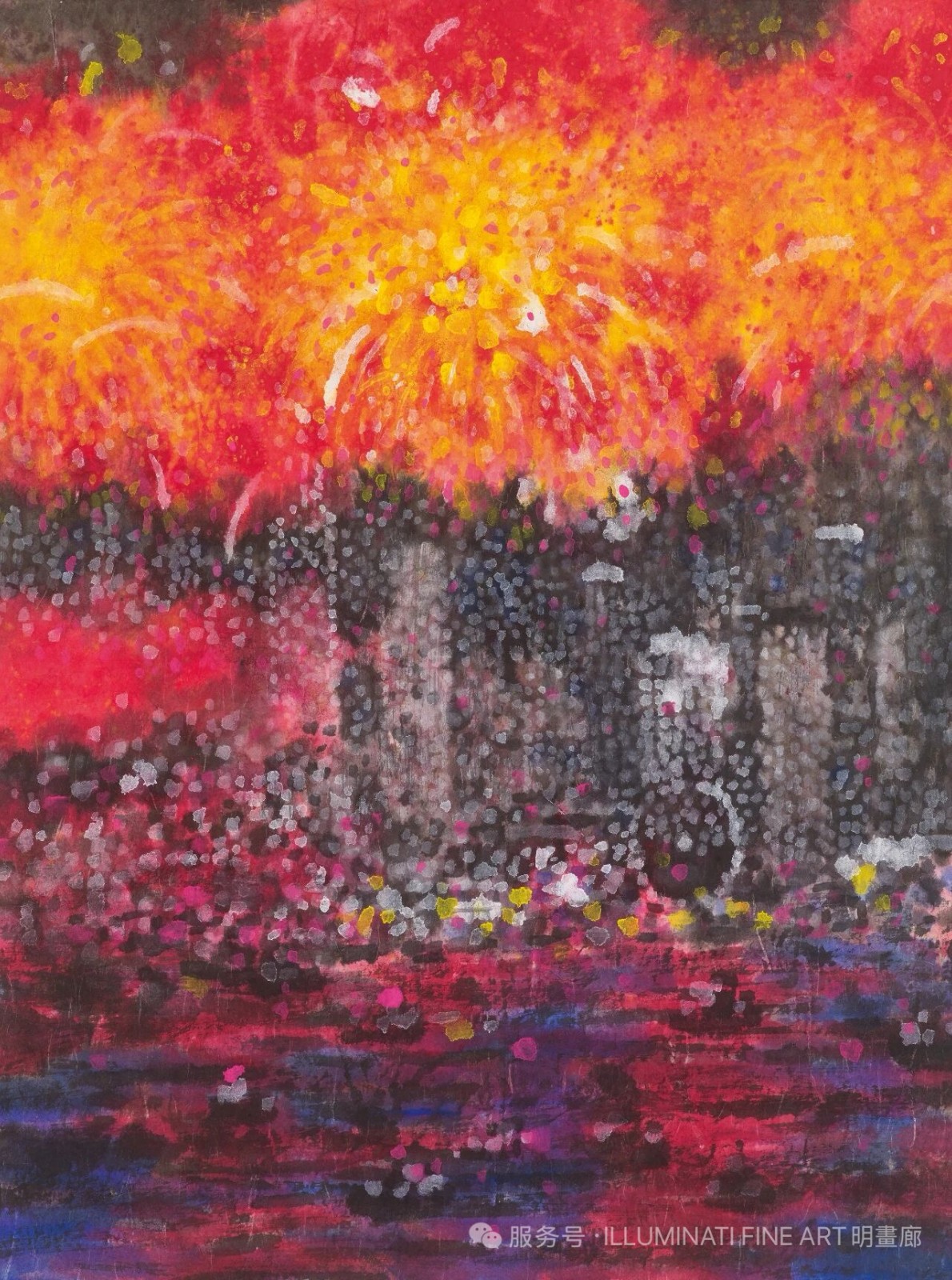 展覽還能細觀藝術家各有千秋的夜景作品,如《街燈》以墨渲染夜間街道,路燈、交通燈及建築物的燈光融合,車輛在夜燈下若隱若現(xiàn);《火樹銀花》描繪香江生氣勃勃、煙火璀璨,筆觸縱放盡,顯都會的繁華熱鬧。