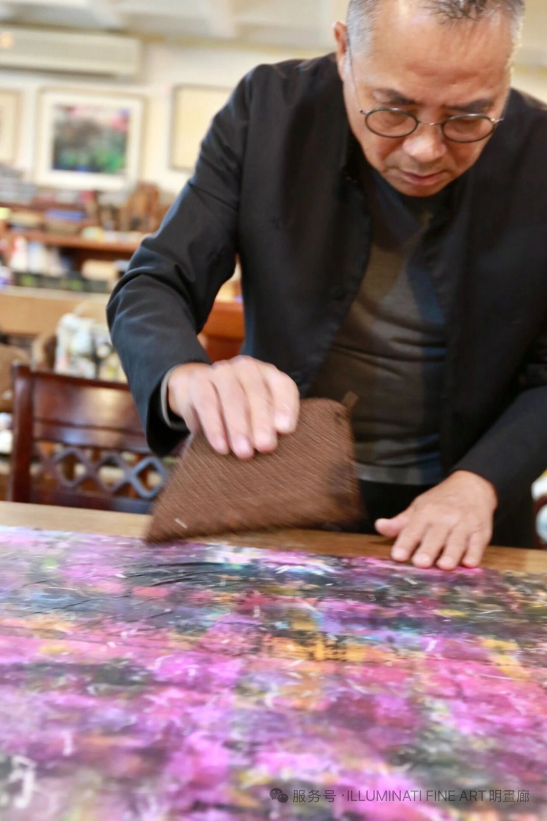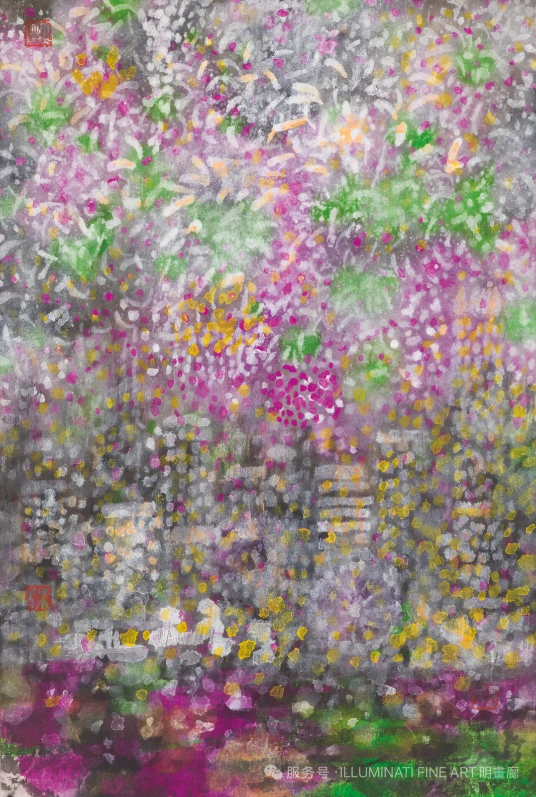 另一作品《雲(yún)來雲(yún)去》以奔放的筆觸縱意點染,虛實相生間盡顯筆參造化,恍如一曲悠揚的香江夜歌。作品雖承襲傳統(tǒng)山水「近中遠」三段畫法,卻打破了遠淡近濃的成規(guī):夜間的遠山不見傳統(tǒng)的朦朧感,反而以濃墨重彩顯豁於畫面;中景則巧妙虛化,讓夜色中的中環(huán)樓群在霧氣與燈光間更添風姿綽約之態(tài)。