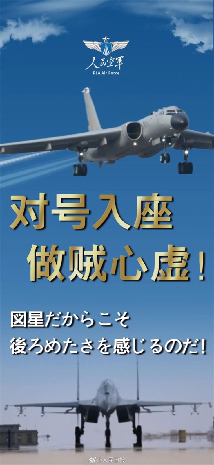 今日20時27分,人民空軍在社交媒體賬號發(fā)布中日雙語海報《大驚小怪,認清常態(tài)》《對號入座,做賊心虛》。