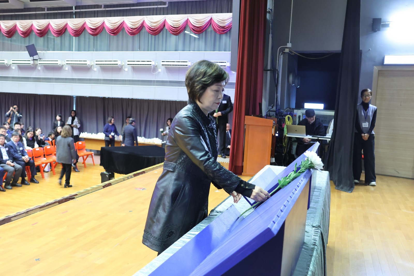 蔡若蓮認(rèn)為粵港澳師生代表一起參與悼念活動,體現(xiàn)三地血脈相連,彰顯中華兒女共同守護(hù)歷史記憶的決心和承擔(dān)。通過獻(xiàn)花、朗讀《和平宣言》、分享感受、話劇演出,表達(dá)對罹難同胞之懷念,對保家衛(wèi)國英烈的崇高敬意。她盼望學(xué)生傳承愛國精神,肩負(fù)時代使命,錘煉過硬本領(lǐng),在世界舞臺上說好中國故事,努力建設(shè)和平美好世界,以行動告慰所有在苦難中逝去之生命。(圖片來源:教育局局長蔡若蓮社交平臺專頁)