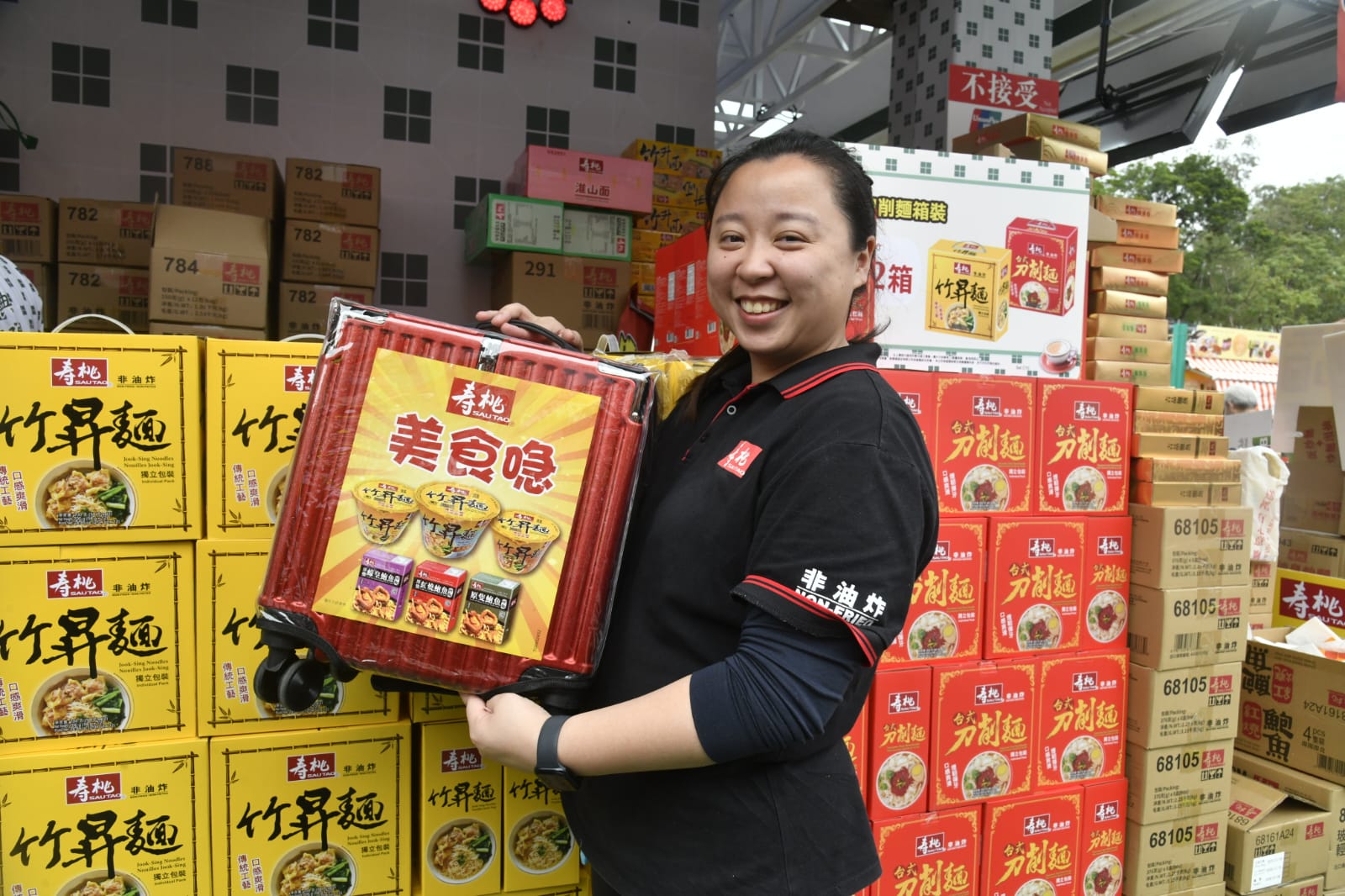 壽桃集團(tuán)助理銷(xiāo)售及市場(chǎng)經(jīng)理鄭芷詠說(shuō),品牌主打產(chǎn)品除了50元兩箱竹昇麵之外,還有賣(mài)120元的「美食福篋」,「美食福篋」內(nèi)有三碗竹昇麵以及三盒鮑魚(yú)撈麵,只在工展會(huì)限定發(fā)售,她說(shuō)客人反應(yīng)十分踴躍,昨晚7時(shí)許8時(shí),已經(jīng)售出50箱合共100個(gè)「美食福篋」,今天再補(bǔ)充貨源,總共有100箱合共200個(gè)「美食福篋」,而「美食福篋」已經(jīng)在今天內(nèi)售罄,需要再度增添貨源。