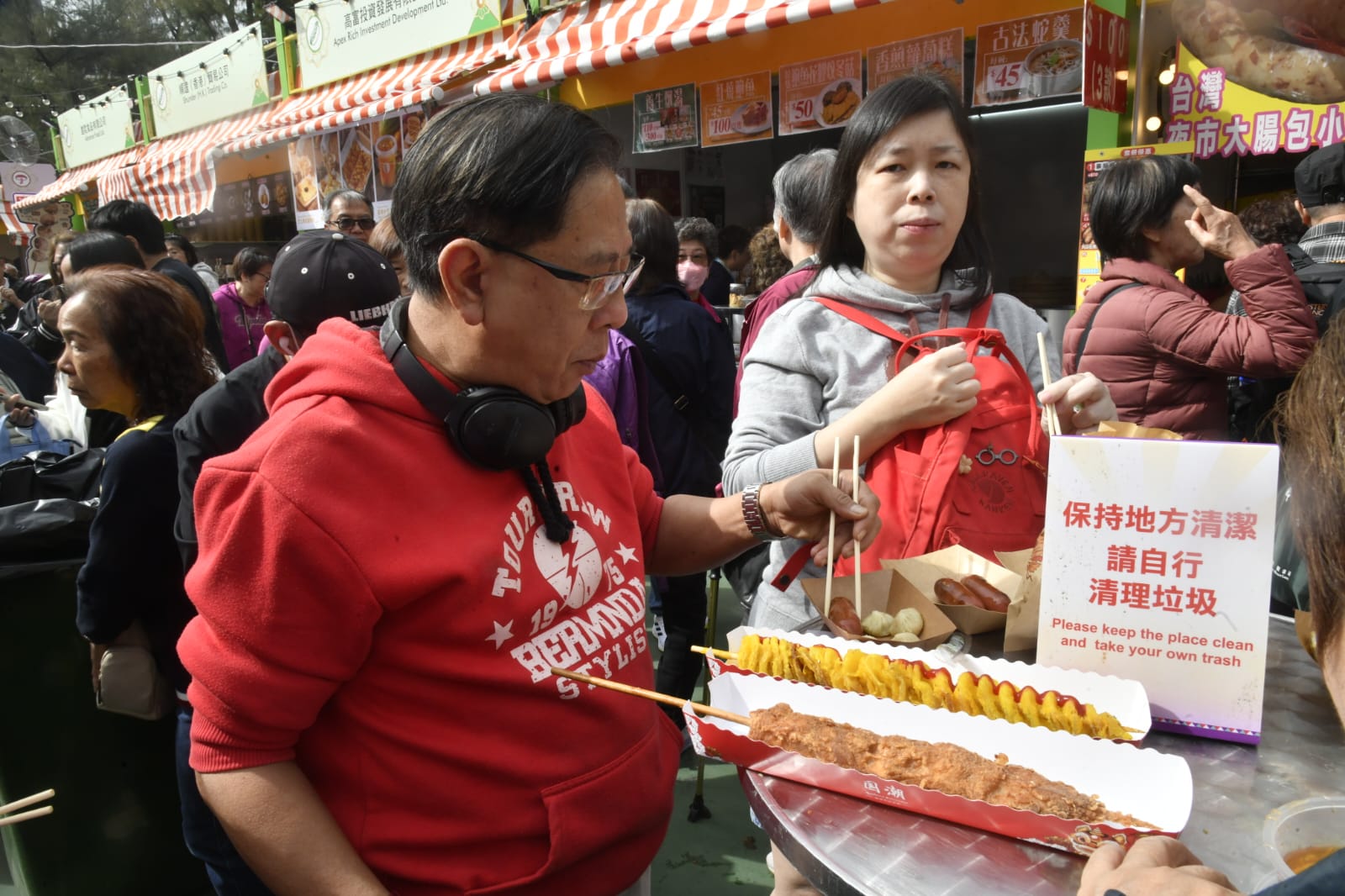 另一入場(chǎng)客人陳太則花費(fèi)了100元購(gòu)買(mǎi)2包豬肉乾、50元2包即食栗子等零食,價(jià)錢(qián)和去年相比差不多,預(yù)料使費(fèi)數(shù)百元。她又說(shuō)氣氛很熱鬧,適逢今日是假期,會(huì)場(chǎng)內(nèi)人頭湧湧,嘆「好難迫到入去心儀產(chǎn)品攤檔」,因此考慮在平日再入場(chǎng)購(gòu)物。(記者 葉家亨/攝影 蔡啟文)
