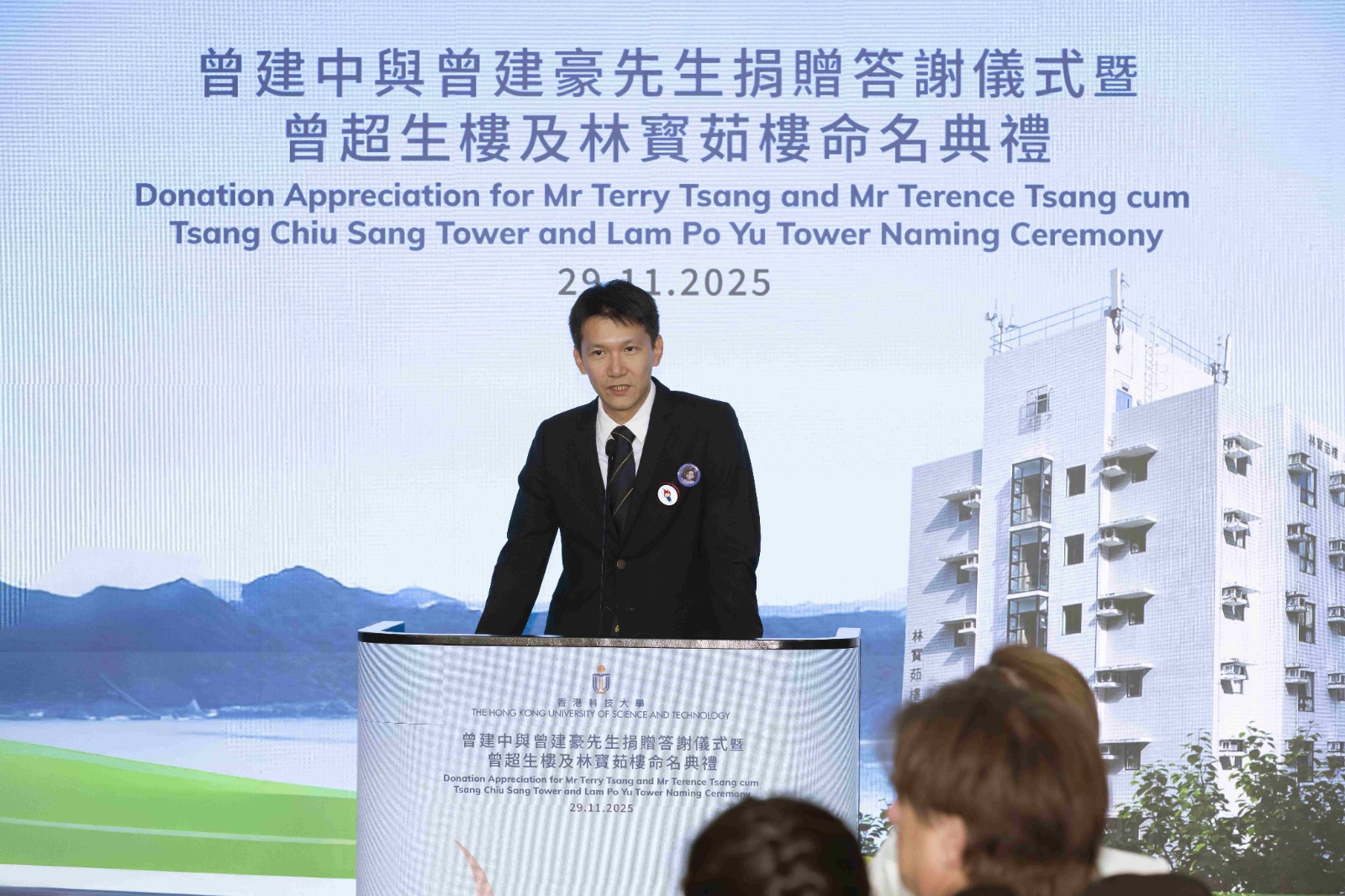 科大早前舉行曾超生樓和林寳茹樓命名揭牌儀式,主禮嘉賓包括校董會主席沈向洋教授、副主席施熙德女士、校長葉玉如教授、捐贈者兼科大校董會成員曾建中先生、捐贈者曾建豪先生、捐贈者胞妹曾翠蓮女士;其他科大管理層亦有出席見證。