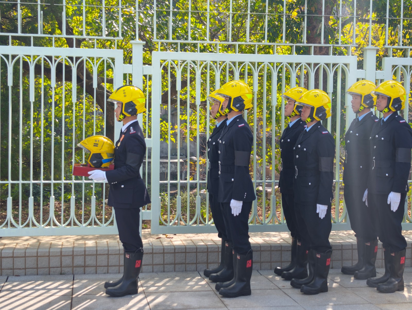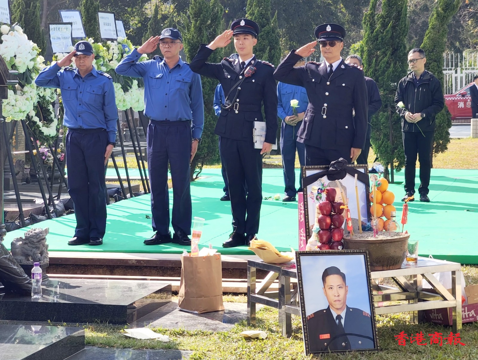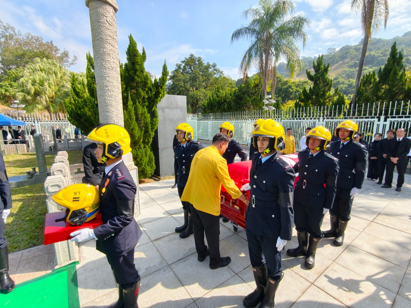 大埔宏福苑11月26日發(fā)生五級大火,造成重大人員傷亡。於滅火行動中不幸殉職的37歲消防員何偉豪,昨日(18日)於紅磡世界殯儀館設(shè)靈,消防處今日(19日)為何偉豪舉行最高榮譽(yù)喪禮。靈車下午約1時(shí)抵達(dá)和合石墳場的浩園進(jìn)行安葬。家屬手持遺照,多名同袍扶靈,何偉豪的頭盔亦放在靈柩上。