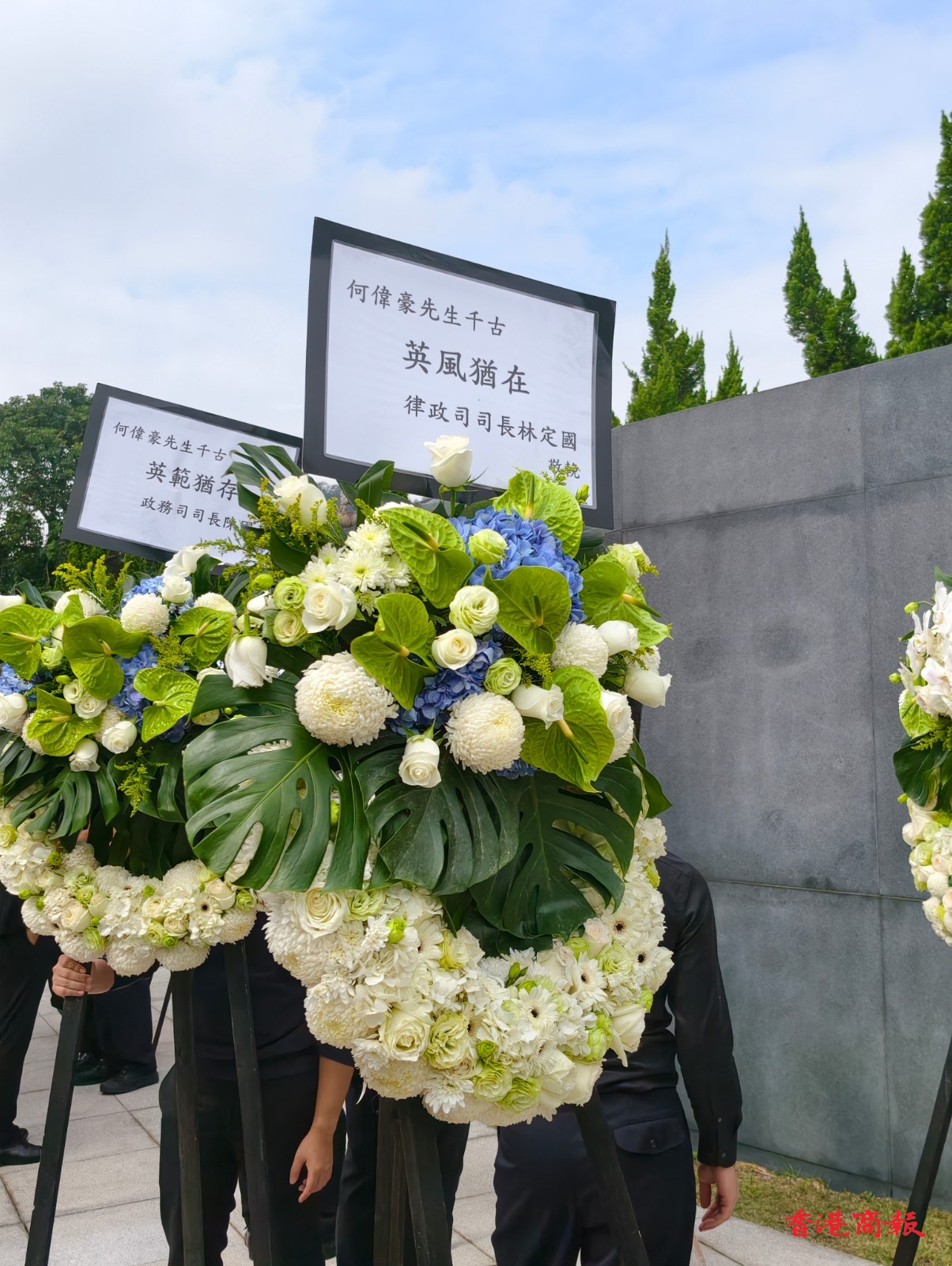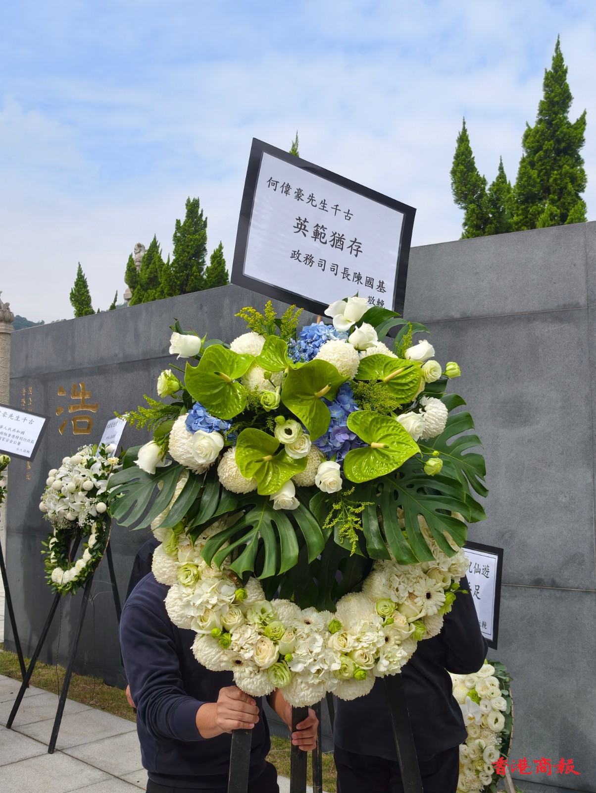 現(xiàn)場莊嚴(yán)肅穆,家屬及消防處處長楊恩健等在場默哀2分鐘,之後輪流在墓前獻(xiàn)花,向何偉豪致敬。何偉豪的墳前擺放近20個(gè)花圈,來自何偉豪的家人和朋友、行政長官李家超、全國政協(xié)副主席梁振英夫婦、政務(wù)司司長陳國基、財(cái)政司司長陳茂波、律政司司長林定國及保安局局長鄧炳強(qiáng)等,還有中聯(lián)辦、解放軍駐港部隊(duì)、中央駐港國安公署及外交部駐港公署等中央駐港機(jī)構(gòu)。