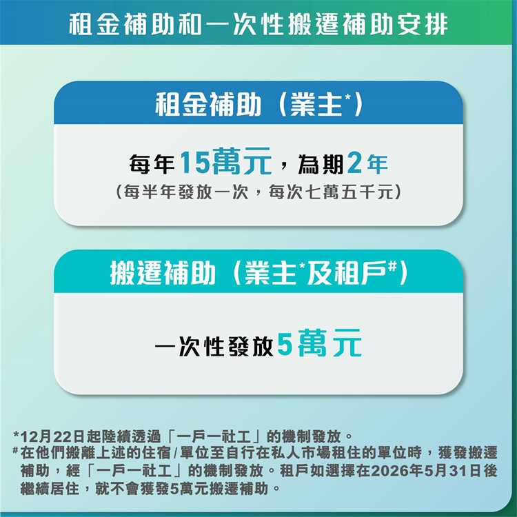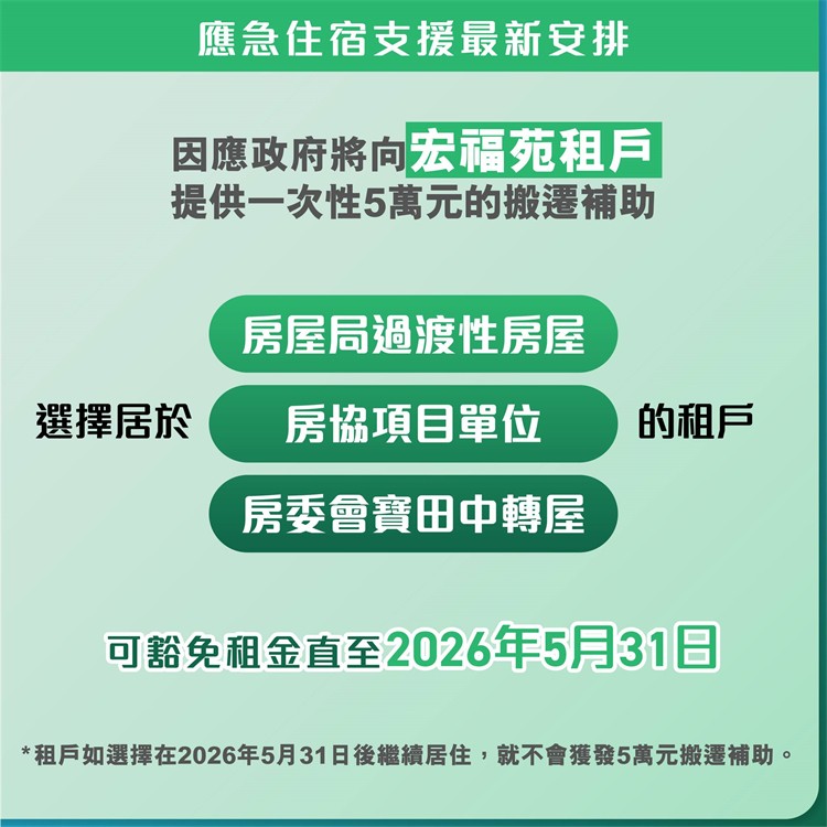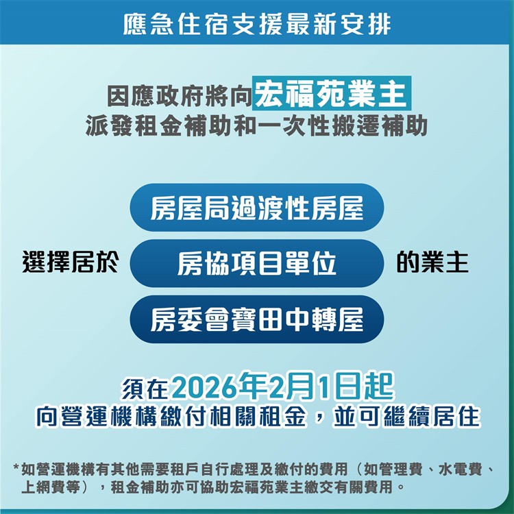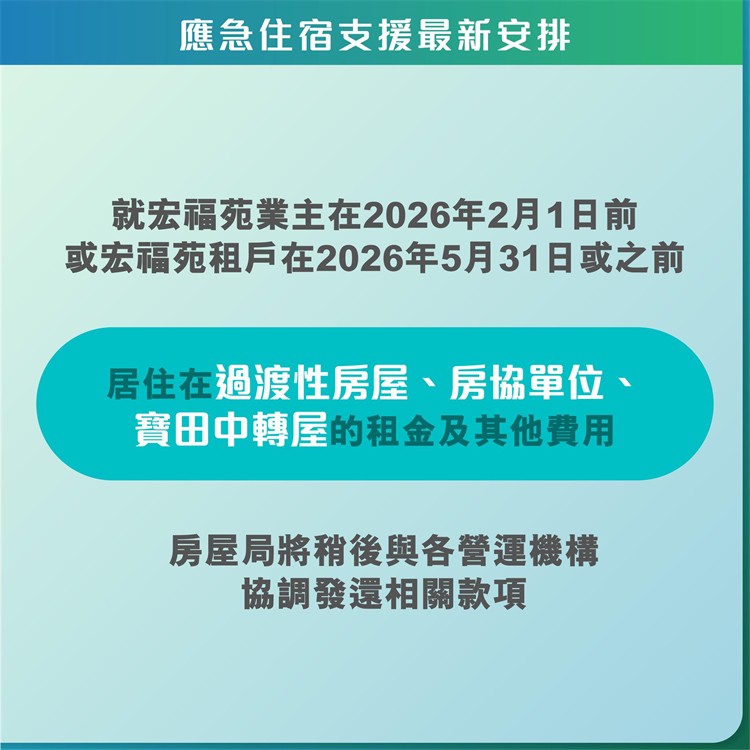 何永賢今日在社交平臺(tái)發(fā)文「官宣」,若選擇住在過渡性房屋、房協(xié)單位及寶田中轉(zhuǎn)屋的宏福苑業(yè)主,須在2026年2月1日起向營(yíng)運(yùn)機(jī)構(gòu)繳付相關(guān)租金,便可繼續(xù)居?。缓旮T纷鈶魟t可豁免租金直至2026年5月31日。至於宏福苑業(yè)主在2026年2月1日前,或宏福苑租戶在2026年5月31日或之前居住在過渡性房屋、房協(xié)單位、寶田中轉(zhuǎn)屋的租金及其他費(fèi)用,房屋局將稍後與各營(yíng)運(yùn)機(jī)構(gòu)協(xié)調(diào)發(fā)還相關(guān)款項(xiàng)。